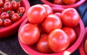 Pyszne świeże pomidory owoców warzyw żywności w czerwonym koszyku z tworzywa sztucznego na rynku tradycji po południu, Seul, Korea Południowa, koncepcja zbiorów, zbliżenie.