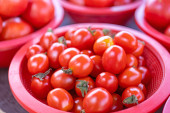 Pyszne świeże pomidory owoców warzyw żywności w czerwonym koszyku z tworzywa sztucznego na rynku tradycji po południu, Seul, Korea Południowa, koncepcja zbiorów, zbliżenie.