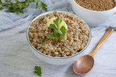 gotowana gryka w talerzu na stole.