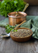 gotowana gryka w talerzu na stole.