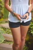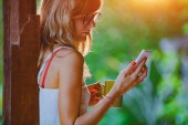 Kobieta za pomocą telefonu komórkowego na zewnątrz w parku/ogrodzie.