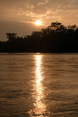 Luang Prabang, Laos-kwiecień 2019: długa łódź nad rzeką Mekong o zachodzie słońca, Luang Prabang, Laos