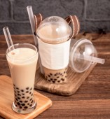 Pyszne herbata bańka mleczna z tapioki Pearl Ball w szkle na drewnianym stole i ciemnym szarym tle cegły, popularne jedzenie i picie na Tajwanie, zbliżenie