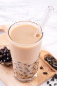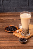 Pyszne herbata bańka mleczna z tapioki Pearl Ball w szkle na drewnianym stole i ciemnym szarym tle cegły, popularne jedzenie i picie na Tajwanie, zbliżenie