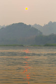 Luang Prabang, Laos-kwiecień 2019: długa łódź nad rzeką Mekong o zachodzie słońca, Luang Prabang, Laos