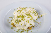 Z bliska soczysty grecki deser. Grecki kataifi z miodem jogurt i tartym pistacji na białej płycie i niewyraźne tło.