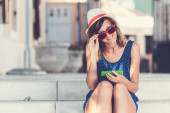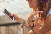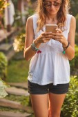 Dziewczyna za pomocą telefonu komórkowego, leżąc na tarasie przy basenie