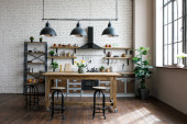 Klasyczna kuchnia z drewnianymi i białymi detalami, minimalistyczny wystrój wnętrz.