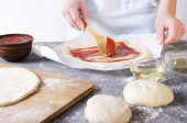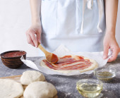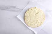 Zbliżenie ciasta pod serwetką na drewnianej płycie. Proces rosnących ciasta, pusta przestrzeń dla Twojego projektu