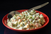 Zdrowe domowe rosyjski tradycyjny Sałatka Olivier gotowy do jedzenia, zbliżenie