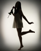 sylwetka młodej kobiecej kobiety w sukni i z różą w rękach, figura Szczupła piękna dziewczyna z kwiatem na białym tle tła