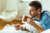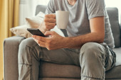 Zdjęcie "Człowiek siedzi na kanapie taras i picie kawy/herbaty podczas usin" może być wykorzystywane do celów osobistych i komercyjnych zgodnie z warunkami zakupionej licencji Royalty-free. Obraz jest dostępny do pobrania w jakości wysokiej rozdzielczości do 5760x3840.