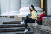 Zdjęcie "Młoda dziewczyna w czerwonym garniturze i białe trampki siedzi na parapecie z notatnikiem i książką w rękach. Piękny widok na ruch miejski. Dobry wieczór, zachód słońca. Przestrzeń kopiowania" może być wykorzystywane do celów osobistych i komercyjnych zgodnie z warunkami zakupionej licencji Royalty-free. Obraz jest dostępny do pobrania w jakości wysokiej rozdzielczości do 5760x3840.