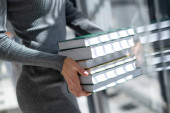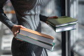 Zdjęcie "Młoda biała dziewczyna w czerwonym garniturze siedzi przy stole w bibliotece, księgarni, biurze i patrzy na notatnik, czyta książkę. Piękna perspektywa. Rozważania. przestrzeń kopiowania" może być wykorzystywane do celów osobistych i komercyjnych zgodnie z warunkami zakupionej licencji Royalty-free. Obraz jest dostępny do pobrania w jakości wysokiej rozdzielczości do 5760x3840.