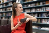 Młoda biała dziewczyna w czerwonym garniturze siedzi przy stole w bibliotece, księgarni, biurze i patrzy na notatnik, czyta książkę. Piękna perspektywa. Rozważania. przestrzeń kopiowania