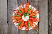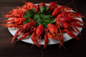czerwone homary, plasterki cytryny i zielone zioła na białym tle
