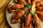 selektywne skupienie czerwonych homarów i zielonych ziół na białym tle