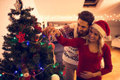 Ojciec i córka dekorowanie cristmas drzewo razem w Dom.