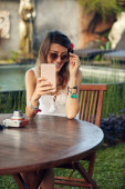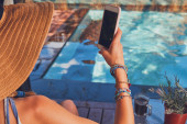 Dziewczyna za pomocą telefonu komórkowego, leżąc na tarasie przy basenie