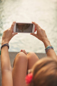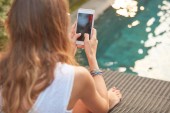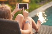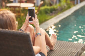 Dziewczyna za pomocą telefonu komórkowego, leżąc na tarasie przy basenie