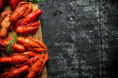 Zdjęcie "Widok z góry na czarną płytkę z czerwonymi homary w pobliżu plasterków cytryny, papryki i zielonych ziół na szarej powierzchni teksturowanej" może być wykorzystywane do celów osobistych i komercyjnych zgodnie z warunkami zakupionej licencji Royalty-free. Obraz jest dostępny do pobrania w jakości wysokiej rozdzielczości do 5760x3840.