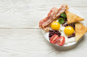 Widok z góry na smaczny bekon, jedno jajko i dwa kawałki chleba na drewnianym stole.