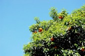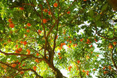 drzewo z zielonymi liśćmi i dojrzałych mandarynki pod niebo z chmur w Rzymie, Włochy