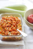 Gulasz do squasha z marchewką i pomidorami w kwadratowej szklanej naczyniu