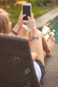 Dziewczyna za pomocą telefonu komórkowego, leżąc na tarasie przy basenie