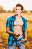 Muskularny fitness młody męski zabytkowe doskonały mięśnie sześć opakowania z ABS i nagi skrzynia. Kulturysta model pociągów z rozciągania elastyczny na ciemnym tle w studiu. Trening treningowy siłownia