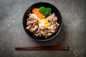 Zdjęcie "Donburi, wieprzowina miska ryżu z onsen jaj i warzyw" może być wykorzystywane do celów osobistych i komercyjnych zgodnie z warunkami zakupionej licencji Royalty-free. Obraz jest dostępny do pobrania w jakości wysokiej rozdzielczości do 5760x3840.