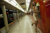 moda modelu pozowanie seksowny, ubrany długi niebieski strój wieczorowy lokalizacji na dachu konstrukcji metalowych most na tle