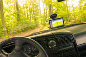 czerwony samochód stoi obok pola gdzie gwałt kwiecie. a w oddali widać turbin wiatrowych