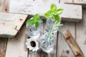 Zioła lecznicze: gałęzie czerwonych dojrzałych truskawek, białe stokrotki i liście mięty stoją w szklance wody na drewnianej pni