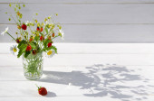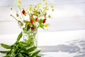 Zioła lecznicze: gałęzie czerwonych dojrzałych truskawek, białe stokrotki i liście mięty stoją w szklance wody na drewnianej pni