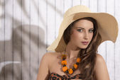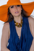portret seksowny blond dziewczyna nosi kapelusz lato i niebieska sukienka