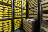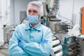 Portret inspektora stojącego w dziale produkcyjnym fabryki mleczarskiej i wziąć pod widok Redy produkcji