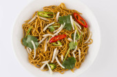 Chow Mein makaron danie z warzywami. czerwona papryka, marchew, groszek śnieżny i kiełki fasoli.