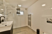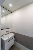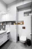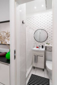 Zdjęcie "Wnętrze łazienki na poddaszu. Kąpiel, Szafka z umywalką i dwie Zawory wodne, lustro, okno i dach słoneczny." może być wykorzystywane do celów osobistych i komercyjnych zgodnie z warunkami zakupionej licencji Royalty-free. Obraz jest dostępny do pobrania w jakości wysokiej rozdzielczości do 5760x3840.