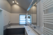 Wnętrze łazienki na poddaszu. Kąpiel, Szafka z umywalką i dwie Zawory wodne, lustro, okno i dach słoneczny.