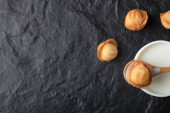 Pożywienie. Ekologiczne orzechy makadamia i szklankę mleka macadamia na tle kamień.
