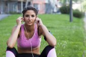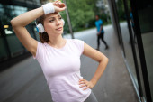 Młoda kobieta Fit słuchania muzyki i pracy przez bieganie w mieście