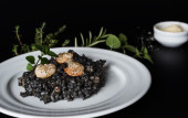 Pyszne włoskie risotto z grilla duże ogony krewetek i atramentu Mątwy (squid-Ink). Czarne risotto. Zdrowe smaczne jedzenie. Widok z góry. Kopiuj przestrzeń.