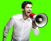 zbliżenie ratownik szalony człowiek krzyczy w megafon na biały