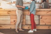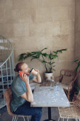 Zrelaksowany Brodaty człowiek jest zabawy z smartphone w kawiarni