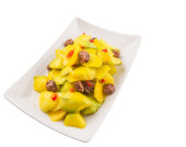 Sambal goreng ATI Kentang, kuchnia Indonezyjska, pikantne cubed wątroby kurczaka i ziemniaki udekorować z kaffir liść limonki i czerwone chili. Żółte tło, spacja ujemna