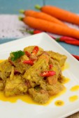 Sambal goreng ATI Kentang, kuchnia Indonezyjska, pikantne cubed wątroby kurczaka i ziemniaki udekorować z kaffir liść limonki i czerwone chili. Żółte tło, selektywne ogniskowanie