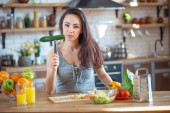 Zdjęcie "Piękna młoda kobieta zjada sałatkę warzywna. Dziewczyna z przyjemnością stawia kawałek świeżego pomidorów w ustach" może być wykorzystywane do celów osobistych i komercyjnych zgodnie z warunkami zakupionej licencji Royalty-free. Obraz jest dostępny do pobrania w jakości wysokiej rozdzielczości do 5760x3840.