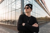 Przystojny młody Hipster człowiek w Bluza z kapturem w Czapka bejsbolowa w okulary przeciwsłoneczne z plecaka stoi w pobliżu rocznika budynku w słoneczny dzień. Amerykański facet podróżuje po ulicach miasta.