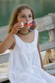 Little cute baby girl robi pęcherzyki mydła w parku w letni dzień